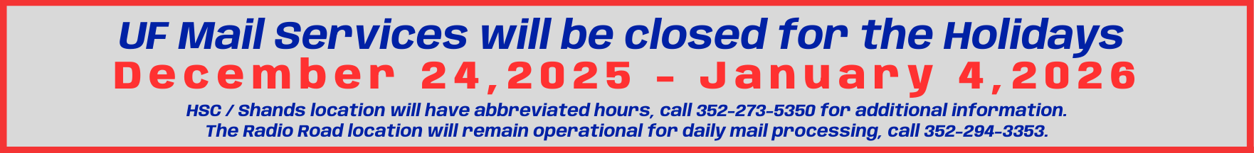 - Mail Services delivers to UF Main Campus and Shands/Health Science Center.